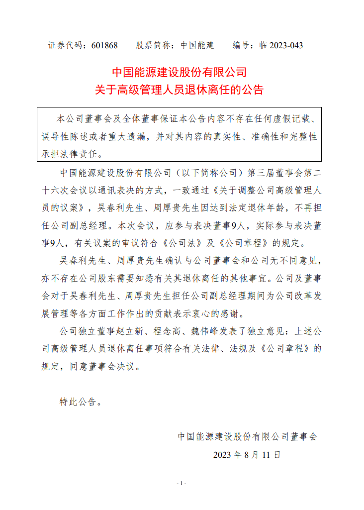 国际能源网/风电头条获悉,8月11日,中国能源建设股份有限公司(简称中国能建)发布关于高级管理人员退休离任的公告。