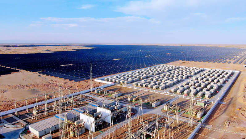 该项目位于新疆维吾尔自治区伽师县克孜勒博依镇附近,是该县首座沙漠电站,中国能建葛洲坝三公司承建标段内分为112个光伏发电区,共计302304根桩基,25192套支架,705376块光伏板。项目采用生态光伏治沙模式,充分利用南疆地区太阳能资源禀赋、可利用土地富余等自然优势条件,实现光伏发电、治沙固沙、生态修复等多重功能。针对日照间歇性、波动性和不可预测性等特点,项目还将光伏发电与储能系统相结合,在伽师光伏电站配套建设了150兆瓦/600兆瓦时超大型电化学储能电站。项目全容量并网后,每年最大发电量可达10.4亿千瓦时,可节约标煤31.2万吨,减排二氧化碳81.2万吨,可起到电网“调节器”作用,极大地提升了当地电力系统稳定性、可靠性。