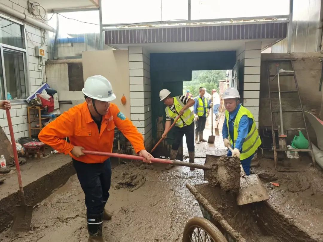 8月9日,中国能建组织工作人员对榆中马坡乡峡口村住户家中及道路的淤泥和垃圾进行清理,协助马坡乡政府向受灾群众发放生活物资。
