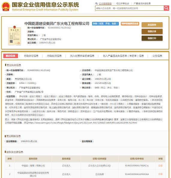 国家企业信用信息公示系统显示,中国能源建设集团广东火电工程有限公司成立于1986年,注册资本109477.71万元人民币,法定代表人为丁毅,大股东为中国能源建设集团南方建设投资有限公司。