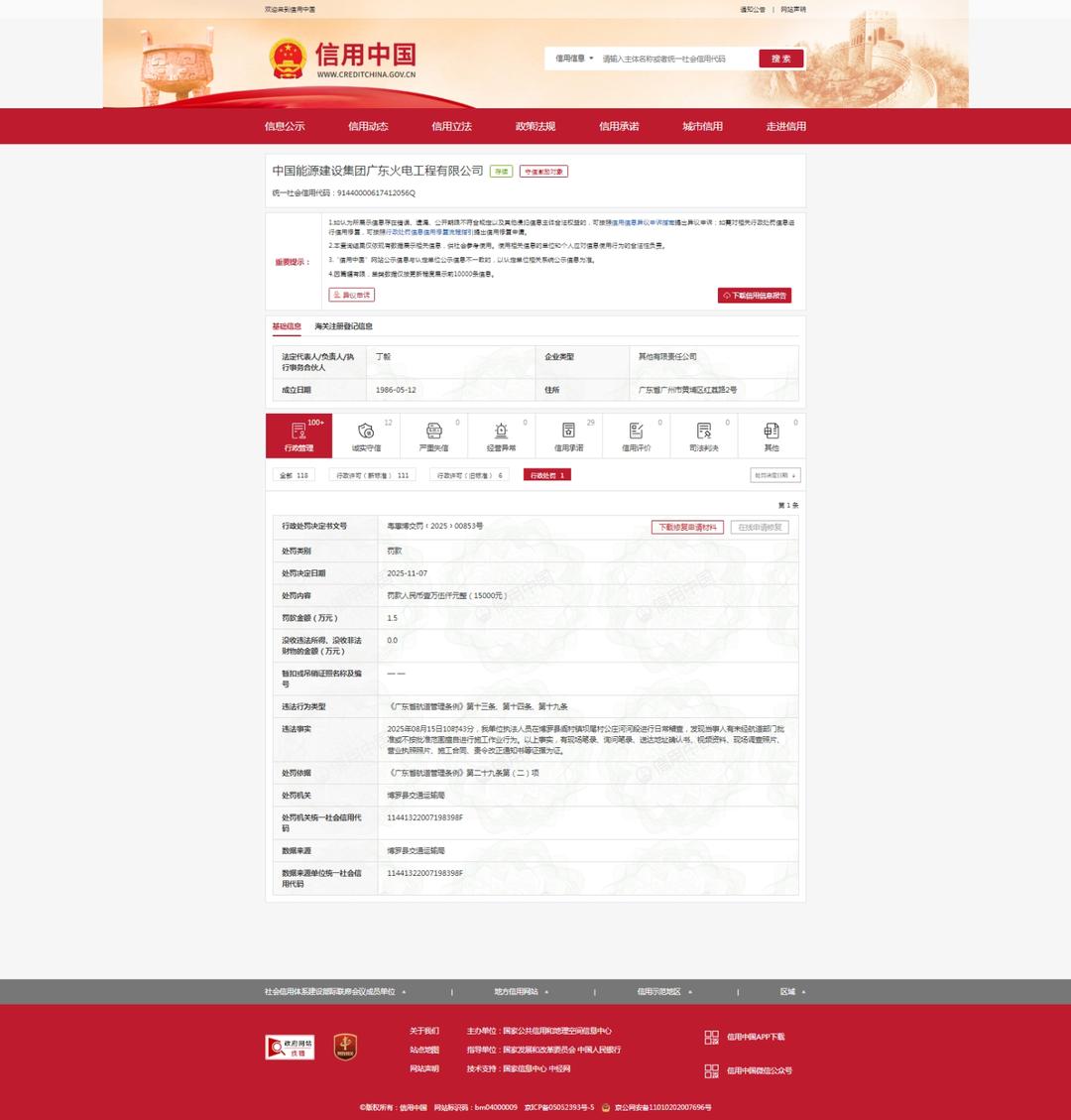 齐鲁晚报·齐鲁壹点记者于信用中国行政处罚信息栏获悉,11月7日,中国能建旗下的中国能源建设集团广东火电工程有限公司(下称“中国能建广东火电公司”)收到罚单,其处罚类别是“罚款”,处罚机关为博罗县交通运输局。