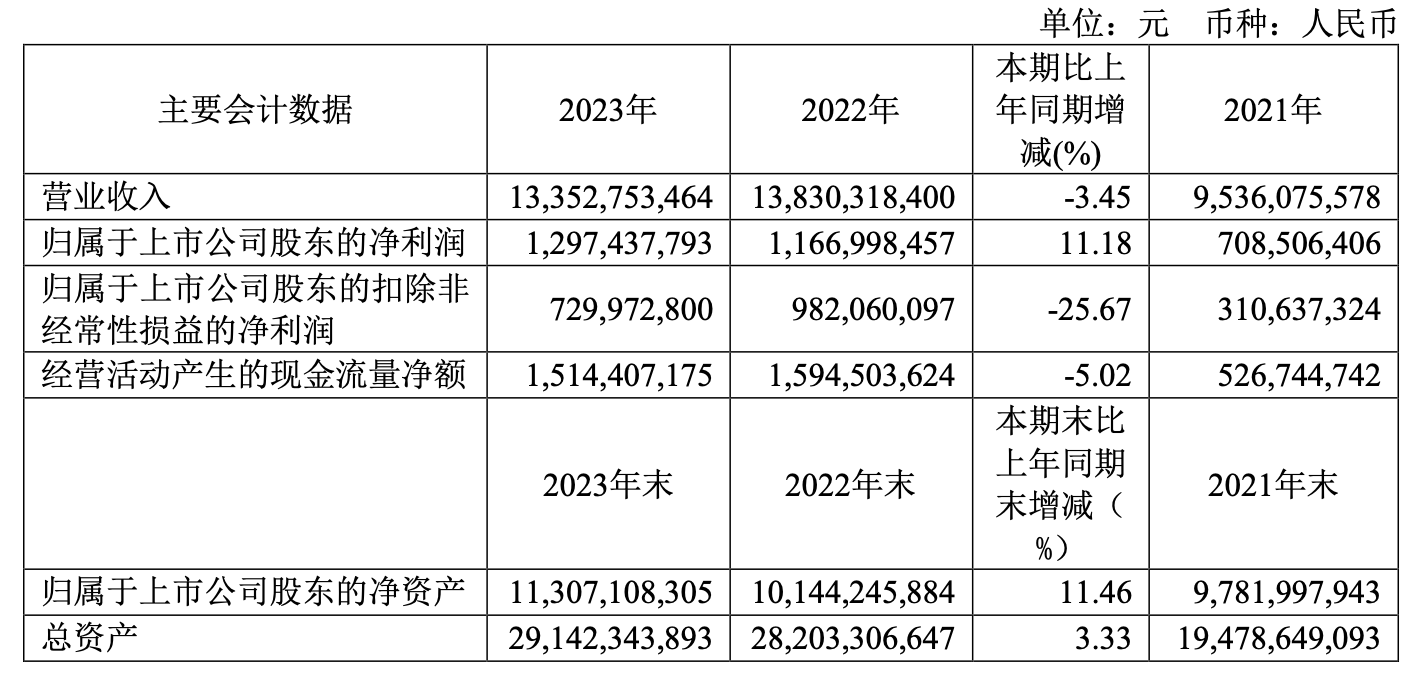 光纤光缆龙头长飞光纤昨日晚间发布了2023年年报。报告显示,2023年实现营收133.53亿元,同比微降3.45%;净利润12.97亿元,同比增长11.18%;扣非后净利润7.30亿元,同比下降25.67%。经营毛利率为24.50%,同比上涨约1个百分点。