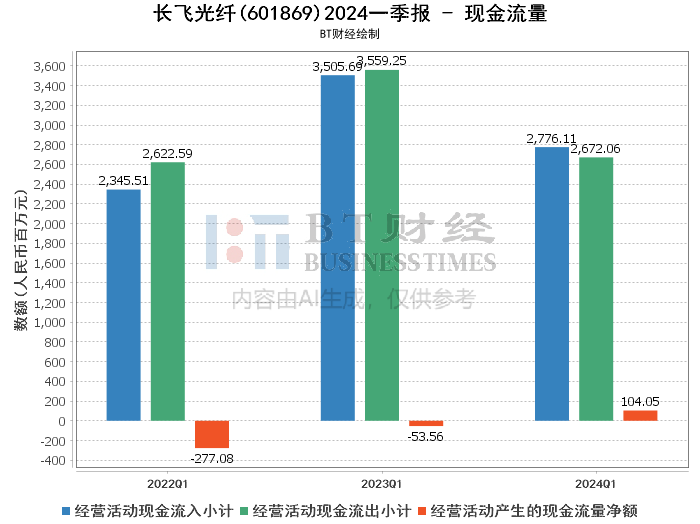 现金流量数据方面,长飞光纤在2024年第一季度的表现有所改善。经营活动产生的现金流量净额为1.04亿元,而上年同期为-53.56百万元,显示出公司在经营活动中的现金流管理有所加强。经营活动现金流入小计为27.76亿元,同比减少20.81%;现金流出小计为26.72亿元,同比减少24.92%。尽管经营活动现金流入减少,但现金流出减少幅度更大,导致净现金流量转正。这表明公司在控制支出和提高现金流管理效率方面取得了一定成效。