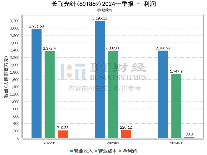 在利润数据方面,长飞光纤的表现不尽如人意。2024年第一季度,公司实现营业收入23.87亿元,同比下降25.29%。归属于上市公司股东的净利润为57.92百万元,同比大幅下降75.97%;扣除非经常性损益后的净利润为24.42百万元,同比下降89.36%。基本每股收益和稀释每股收益均为0.08元,同比下降75.00%。毛利率为26.8%,较上年同期的25.45%有所提升,但净利率从上年同期的6.89%大幅下降至1.39%。净资产收益率(ROE)也从上年同期的1.5%下降至0.23%。这些数据反映出公司在市场竞争和成本控制方面面临较大挑战,导致利润大幅下滑。