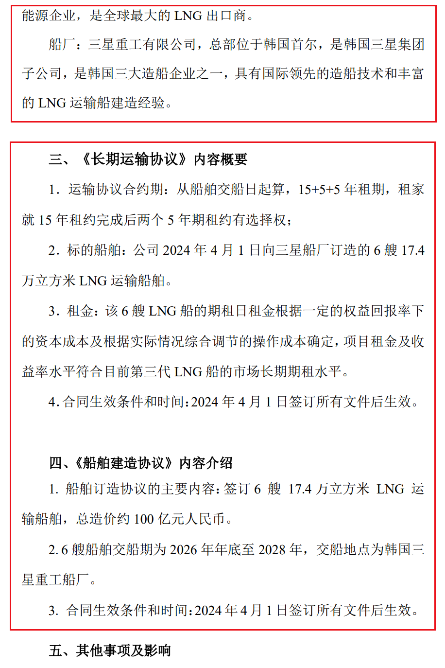 2024年4月1日,招商气运下设的6家单船公司与卡塔尔能源在卡塔尔多哈完成6艘17.4万立方米LNG运输船舶15+5+5年期的《长期运输协议》签署,期租价格参照目前第三代LNG船的市场长期租约运价水平确定。同日,与三星船厂签订6艘17.4万立方米LNG运输船舶的《船舶建造协议》,总船舶造价约为100亿人民币。