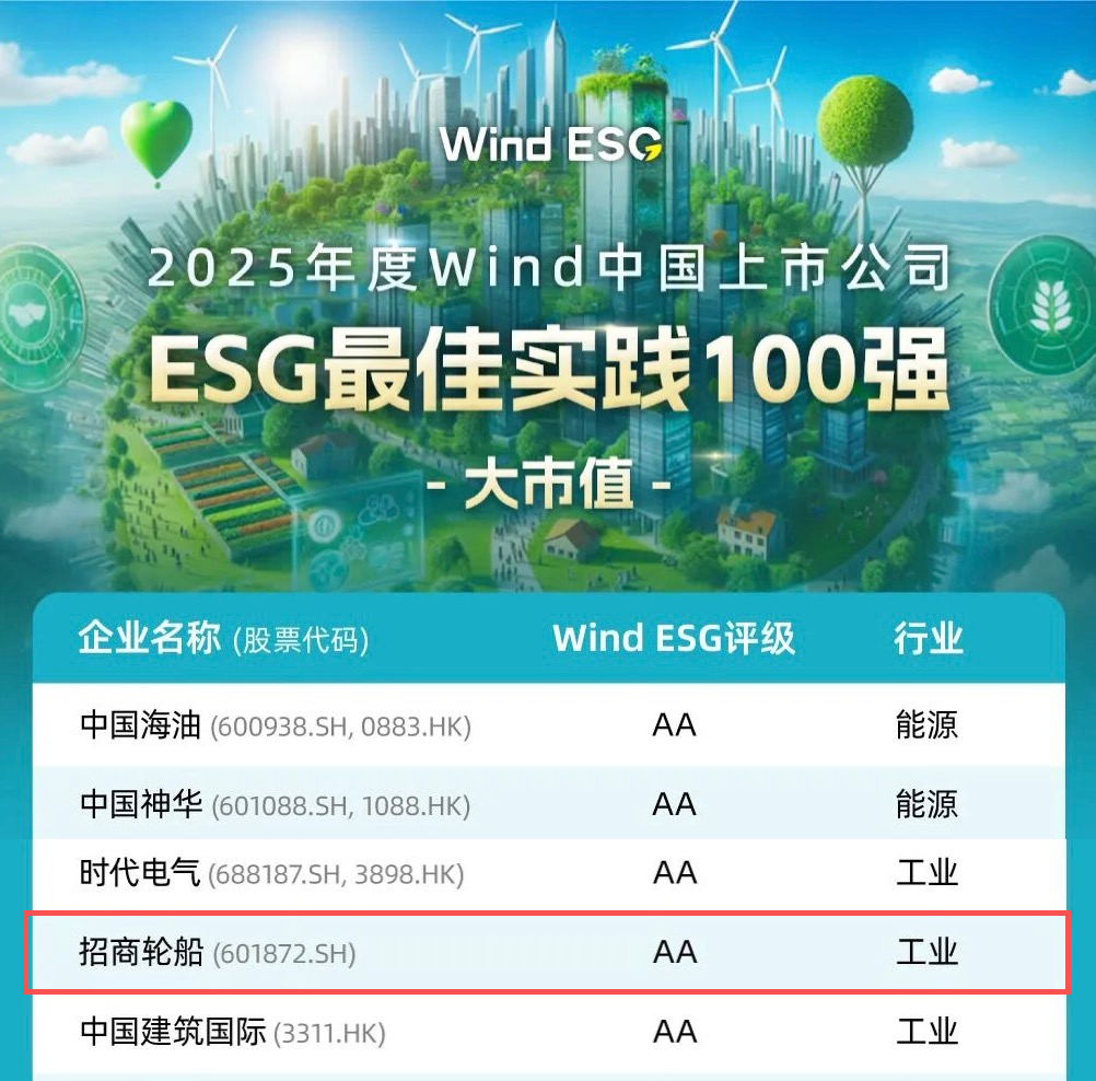 “Wind中国上市公司ESG最佳实践100强”榜单以最新Wind ESG评级为基准,聚焦环境、社会与治理维度的长期价值创造,为资本市场树立可持续标杆,引导资金向具可持续竞争力的企业流动。招商轮船凭借AA级评级、行业排名第一的成绩登上榜单,是对招商轮船ESG治理体系的全面肯定,更是对公司在绿色发展和长期价值创造方面的有力背书。