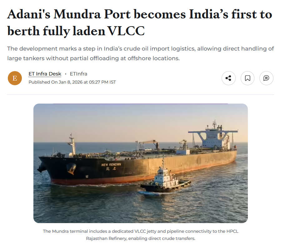 首先,直靠减少外海过驳与二次作业环节,理论上有助于压缩作业链条与时间成本,并降低因海况、拖轮、过驳设备等因素带来的不确定性。其次,蒙德拉位于印度西北海岸,若VLCC直靠常态化,将强化该区域对大批量原油的接卸与分拨能力,进而影响印度不同港区在原油进口中的角色分工与到港结构。