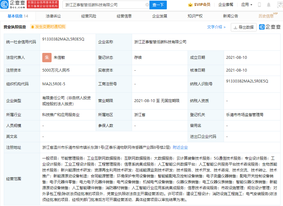 企查查APP显示,8月10日,浙江正泰智慧低碳科技有限公司成立,法定代表人为朱信敏,注册资本5000万元人民币,经营范围包含:节能管理服务;工业互联网数据服务;互联网数据服务;大数据服务;云计算装备技术服务;5G通信技术服务等。