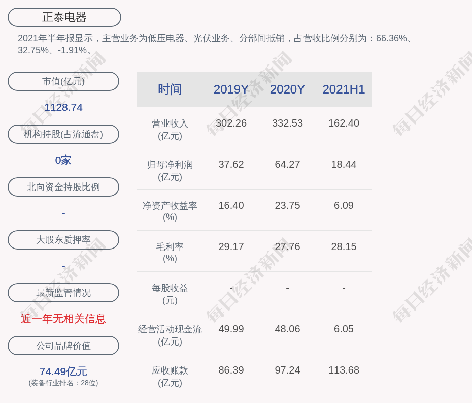 2021年半年报显示,正泰电器的主营业务为低压电器、光伏业务、分部间抵销,占营收比例分别为:66.36%、32.75%、-1.91%。