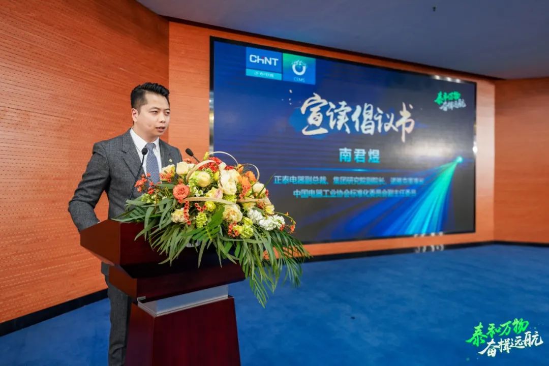 正泰电器副总裁、诺雅克董事长、中国电器工业协会标准化委员会副主任委员南君煜宣读开启盘厂合作伙伴“生态圈”计划倡议书,呼吁盘厂行业精英积极建言献策,齐心协力,共同推动《导则》的实施,为广大合作伙伴提供深入的业务支持,并为行业发展贡献一份力量。