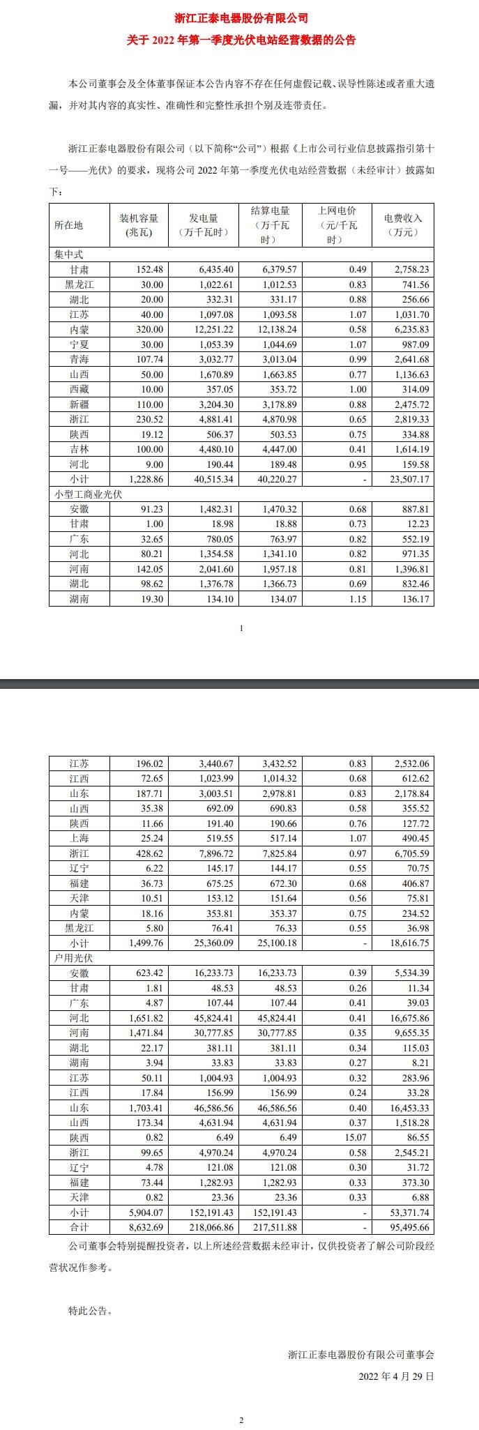 4月29日,正泰电器发布《关于2022年第一季度光伏电站经营数据的公告》。公告显示正泰电器一季度持有光伏电站8.36GW,其中集中式光伏1.23GW,小型工商业光伏1.5GW,户用光伏5.9GW。三者合计发电21.8亿千瓦时,合计收入9.55亿元。