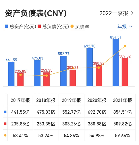 2018年-2021年,正泰电器总负债分别为253.35亿元、303.26亿元、380.88亿元、509.82亿元,呈连年攀升态势;负债率分别53.24%、54.86%、54.98%、59.66%。