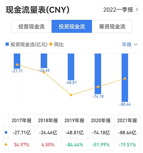 2017年-2021年,正泰电器投资现金流分别为-27.71亿元、-26.46亿元、-48.81亿元、-74.18亿元、-88.66亿元,近五年,其投资现金流持续为负。