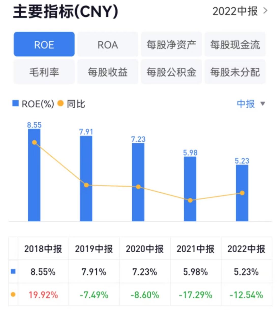 数据显示,2018年至2022年中报,正泰电器ROE分别为8.55%、7.91%、7.23%、5.98%、5.23%。2019年至2022年中报同比分别下降7.49%、8.6%、17.29%、12.54%。