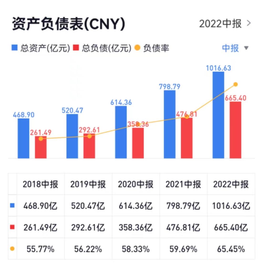2018年至2022年中报,正泰电器总负债分别为261.49亿元、292.61亿元、358.36亿元、476.81亿元、665.4亿元。负债率分别为55.77%、56.22%、58.33%、59.69%、65.45%。