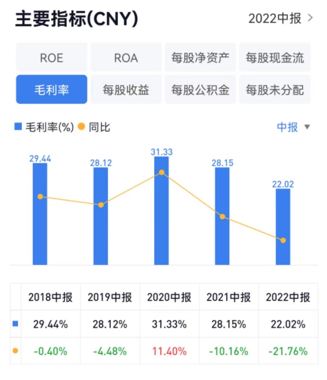 2018年至2022年中报,正泰电器毛利率分别为29.44%、28.12%、31.33%、28.15%、22.02%;2022年中报毛利率同比下降21.76%,为近五年最低。