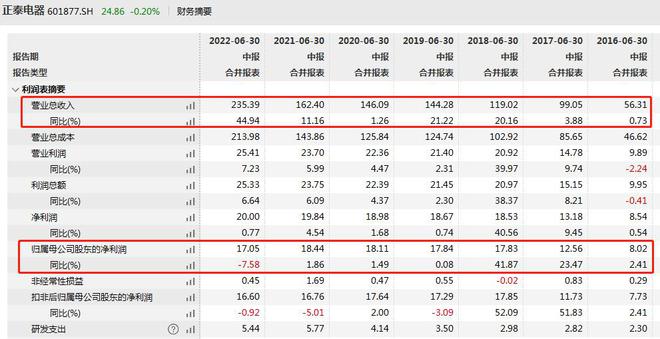 虽然中报营收持续增加,但正泰电器净利增加乏力。2018年至2022年,正泰电器中报净利分别为17.83亿元、17.84亿元、18.11亿元、18.44亿元、17.05亿元。