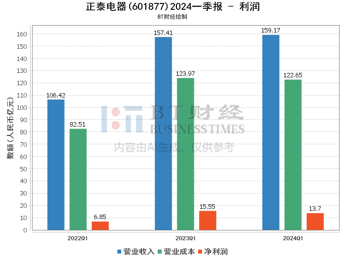 从资产负债数据来看,正泰电器在2024年一季度末的资产总计为1223.34亿元,较期初的1208.05亿元增长了1.27%。负债总计为742.18亿元,较期初的742.98亿元略有减少,资产负债率从期初的61.5%下降至60.67%。这表明公司在保持资产增长的同时,成功控制了负债水平,优化了资产负债结构。此外,商誉保持不变,期末余额为5.28亿元,显示公司在并购方面保持了稳定。