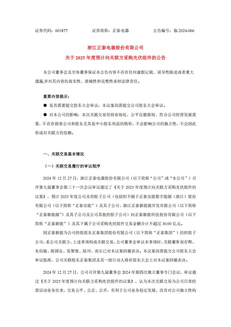 12月28日,正泰电器发布关于2025年度预计向关联方采购光伏组件的公告。
