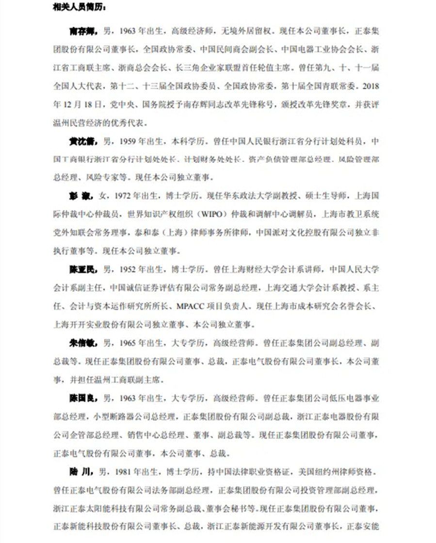 简历显示,陈国良,男,1963 年出生,大专学历,高级经营师。曾任正泰集团公司低压电器事业部总经理,小型断路器公司总经理,正泰集团股份有限公司副总裁,浙江正泰电器股份有限公司企管部总经理、销售中心总经理、董事、副总裁等。现任正泰集团股份有限公司董事,正泰电气股份有限公司董事,本公司董事、总裁。
