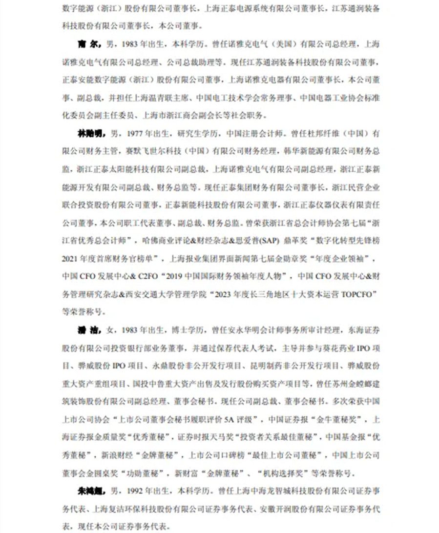 简历显示,张智寰,女,1975 年出生,博士学历,高级经营师。曾任正泰集团公司财经委财务处副处长、投资发展中心总经理助理、浙江正泰电器股份有限公司国际贸易部总经理、董事会秘书、上海诺雅克电气有限公司总经理,并任全球执行总裁主管公司全球低压电器业务。现任江苏通润装备科技股份有限公司董事、正泰安能数字能源(浙江)股份有限公司董事,浙江正泰电器股份有限公司董事、总裁。