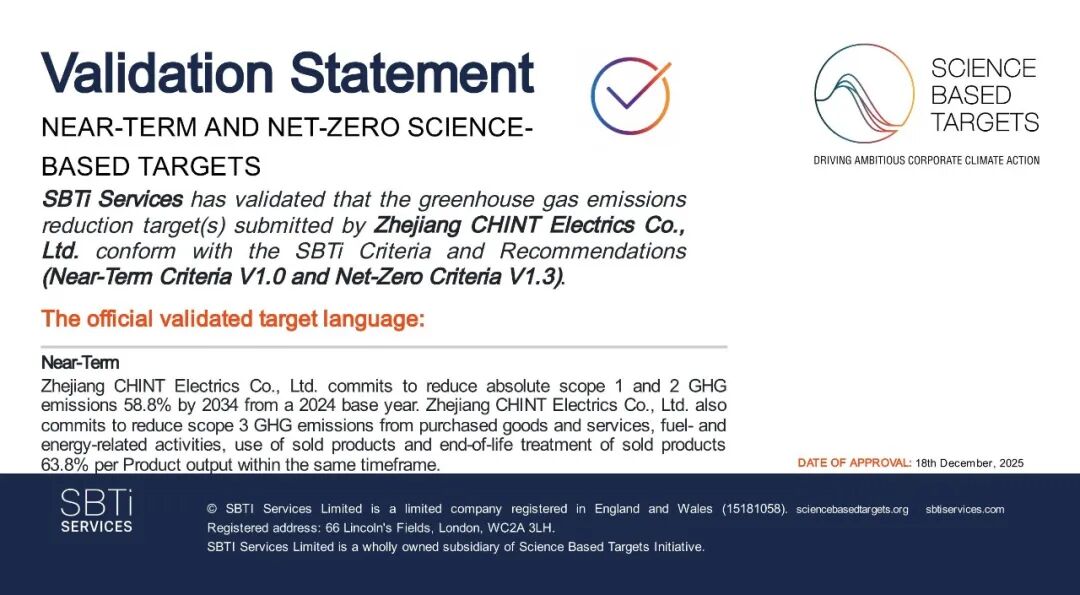 科学碳目标倡议(SBTi)作为全球权威的碳目标验证机构,其认证标准严格对标《巴黎协定》温控目标。此次 正泰电器 提交的减排目标顺利通过验证,彰显了公司在全价值链脱碳上的坚定决心与系统规划。根据SBTi官方验证文件, 正泰电器 郑重承诺,以2024年为基准年,到2034年,范围1和范围2温室气体绝对排放量降低58.8%,同期内,范围3(含采购商品与服务、燃料与能源相关活动、售出产品使用及报废处理等环节)单位产品碳排放强度降低63.8%,该目标于2025年12月18日正式获批,贯通自身生产运营与上下游供应链等核心环节,构建了符合气候科学的“全链条、多维度”脱碳路径,为企业绿色发展长远布局锚定清晰蓝图。