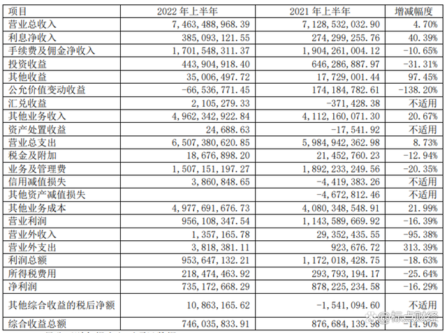 浙商证券2022年中期利润表主要项目数据(单位:元)