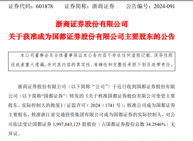 浙商证券(601878)收购国都证券取得较大进展,股权受让得到证监会核准。12月3日,浙商证券发布公告称,于近日收到国都证券转发的《关于核准国都证券股份有限公司变更主要股东、实际控制人的批复》(证监许可(金麒麟分析师)﹝2024﹞1741 号),核准公司成为国都证券主要股东,核准浙江省交通投资集团有限公司成为国都证券的实际控制人,对公司依法受让国都证券 19.97亿股股份(占国都证券股份总数 34.2546%)无异议。