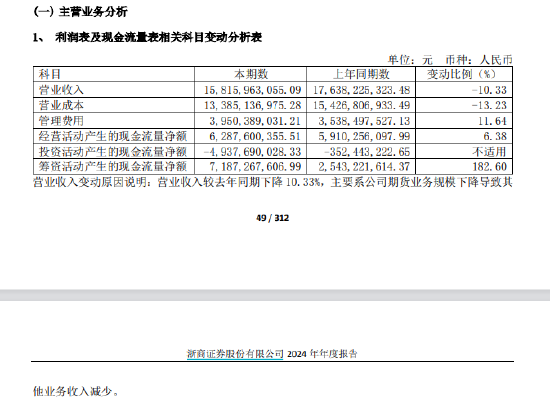 4月10日晚间,浙商证券发布2024年年度报告。报告期内,公司实现营业收入158.16亿元,同比下降10.33%;净利润19.32亿元,同比增长10.17%。值得注意的是,其期货业务实现营业收入103.65亿元,同比下滑17.89%,成为拖累整体业绩的主因。