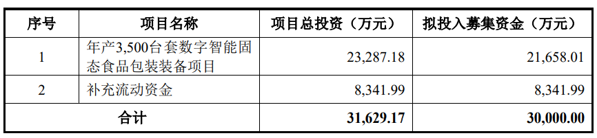 永创智能2025年12月26日披露以简易程序向特定对象发行股票证券募集说明书(申报稿)显示,根据本次发行的竞价结果,公司本次发行拟募集资金总额为299,999,991.23元,不超过30,000万元(含),在扣除相关发行费用后的募集资金净额将全部用于年产3,500台套数字智能固态食品包装装备项目、补充流动资金。