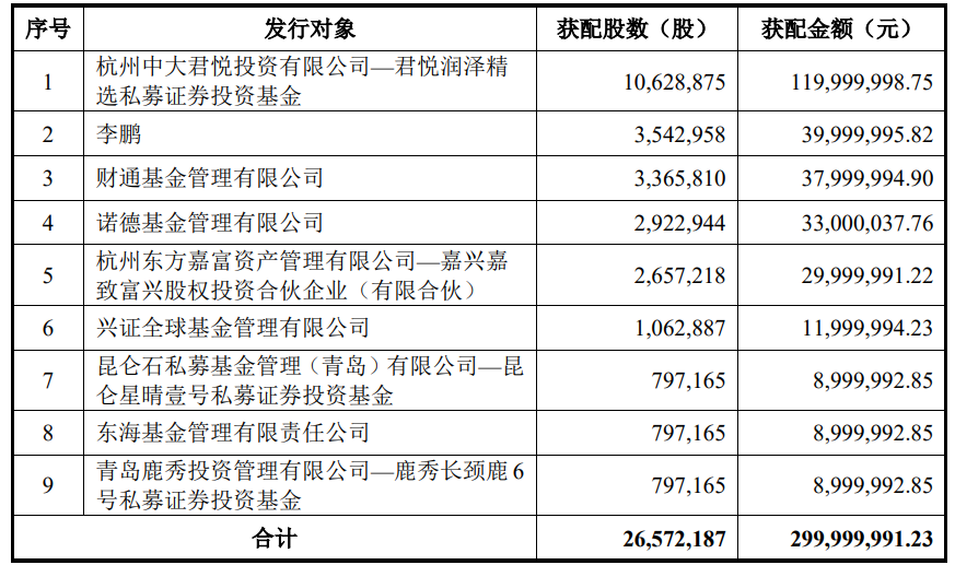 公司本次发行的发行对象为杭州中大君悦投资有限公司—君悦润泽精选私募证券投资基金、李鹏、财通基金管理有限公司、诺德基金管理有限公司、杭州东方嘉富资产管理有限公司—嘉兴嘉致富兴股权投资合伙企业(有限合伙)、兴证全球基金管理有限公司、昆仑石私募基金管理(青岛)有限公司—昆仑星晴壹号私募证券投资基金、东海基金管理有限责任公司、青岛鹿秀投资管理有限公司—鹿秀长颈鹿6号私募证券投资基金。发行对象不超过35名特定对象,所有发行对象均以现金方式认购。上述发行对象在本次发行前后与公司均不存在关联关系,本次发行不构成关联交易。