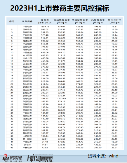 43家券商中,上半年净资本(母公司报表层面,下同)最高的是中信证券,金额为1,354.76亿元,净资本最低的是华林证券,金额仅有42.92亿元。流动性覆盖率最高的是红塔证券,数值为1703.84%;最低的是中信证券,数值为134.61%。净稳定资金率最高的是中银证券,数据为292.73%;最低的是天风证券(125.82%)。风险覆盖率最高的是太平洋,数值为433.83%;最低的还是天风证券,数值为120.13%,已经触及预警线。资本杠杆率最高的是太平洋(65.69 %);最低的是中国银河,数值为10.82%,接近预警线。