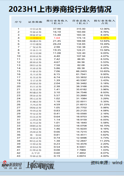 今年上半年,广发证券投行业务收入占总营收的比值为0.94%,在43家上市券商中排名垫底,显著低于头部券商中信证券的12.06%、华泰证券的8.76%、国泰君安的8.44%、海通证券的12.64%、中信建投的19.49%、中金公司的15.58%。