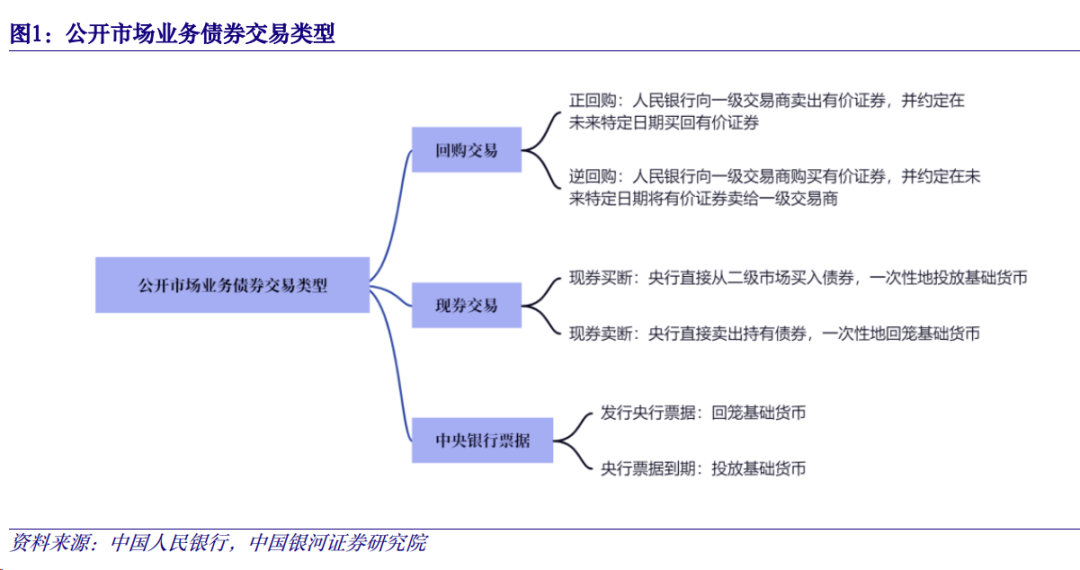 从交易品种看,公开市场业务债券交易主要包括3种类型:回购交易、现券交易和发行中央银行票据。短期流动性调节工具(SLO)作为公开市场常规操作的补充。这些交易都是央行从市场上回收和投放流动性的方式,可以改变基础货币的数量。