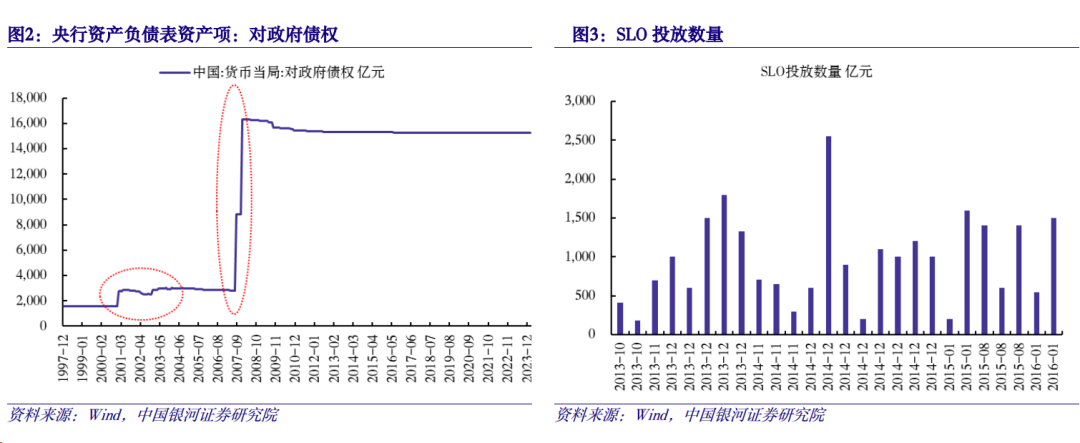 2007年,财政部发行1.55万亿元特别国债用于成立中投公司,央行曾在二级市场买入该特别国债,当时的操作并没有扩表,表现为资产端项目的转换,“外汇”项减少,“对政府债权”项增加。并非常规的投放基础货币操作。观察央行资产负债表,2001年-2004年,“对政府债权”项目有金额波动,有可能为现券交易的常规操作,但是我们在央行官网的公开披露中尚未找到相关信息。