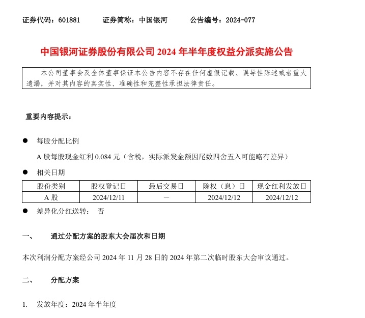 12月5日,中国银河发布《2024年半年度权益分派实施公告》(下称《公告》)。根据《公告》,此次A股每股现金红利0.084元(含税),股权登记日为12月11日,除权(息)日、现金红利发放日均为12月12日。