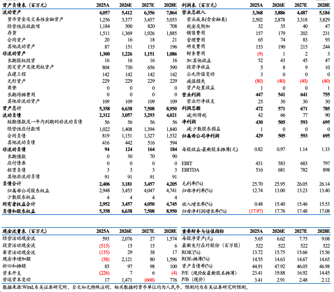 2025年公司销售净利率为12.76%,同比-2.84pct。净利率降幅高于毛利率主要系期间费用率有所提升。2025年公司期间费用率为10.88%,同比+0.86pct,其中销售/管理/财务/研发费用率分别为4.66%/ 1.93%/-0.26%/ 4.55%,同比+0.98pct/+0.40pct/-0.12pct/-0.40pct。销售费用率提升主要系公司加大海外市场开拓及渠道投入;管理费用率小幅上升;财务费用为负且绝对值扩大,主要系利息收入增加。