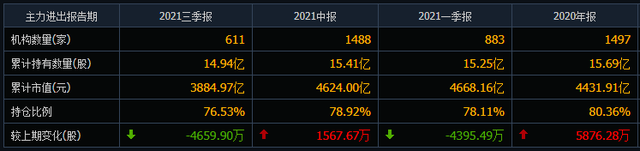 从中国中免的主力进出报告期显示的机构家数可以看出,2021三季报的机构家数为611家,与一季报的883家相比,减少了30.80%。