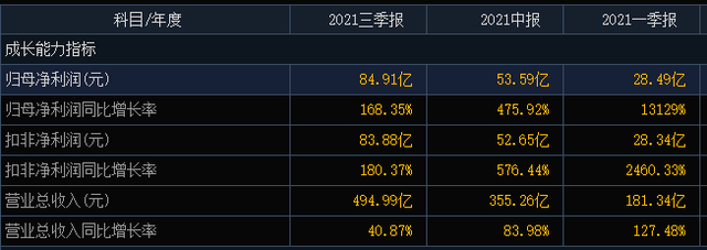 最近三个季报的业绩数据显示,营业总收入为181.34亿元、355.26亿元、494.99亿元,同比分别增长127.48%、83.98%、40.87%;归属于母公司股东的净利润为28.49亿元、53.59亿元、84.91亿元,同比分别增长13129%、475.92%、168.35%。