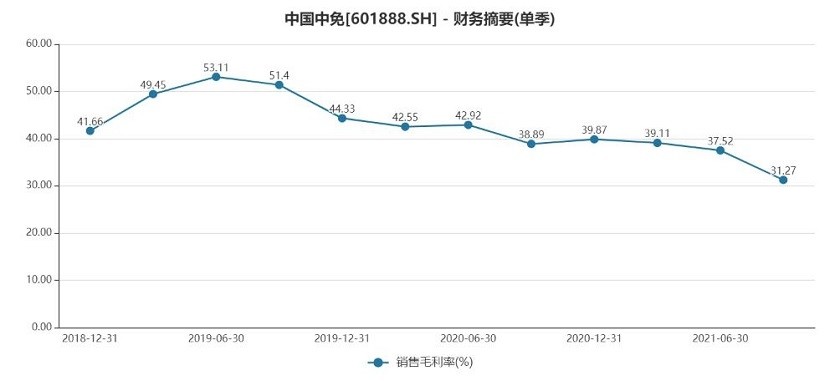 对中免造成影响的还有毛利率承压的因素。第三季度,中国中免毛利率仅有31.27%,比上季度的37.52%下降6.25个百分点。此前,第二季度毛利率也有较大幅下滑,中国中免表示是因为开展一系列折扣促销活动所致。事实上,中国中免从“离岛”免税政策落地以来,毛利率就一路下滑,只是最近加速较为明显,已经影响到盈利能力。
