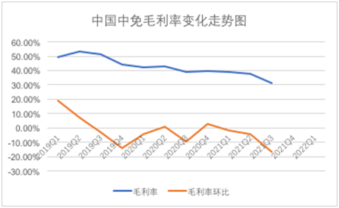 疯狂价格战的背后,是免税运营商毛利率的逐渐走低。根据财报,2021年第三季度,中国中免毛利率仅为31.27%,环比大幅下降,剔除一次性首都机场租金返还及所得税优惠后,2021年中免Q3的真实净利润仅为12.5亿元,同比2020 Q3的22.3亿元及环比2021 Q2的 25.1亿元分别下降43.9%和50.2%,可谓业绩暴雷。