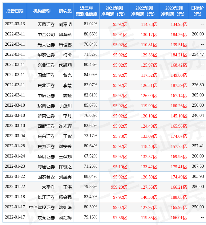 证券之星数据中心根据近三年发布的研报数据计算,国泰君安刘越男研究员团队对该股研究较为深入,近三年预测准确度均值高达88.04%,其预测2021年度归属净利润为盈利95.92亿,根据现价换算的预测PE为36.98。