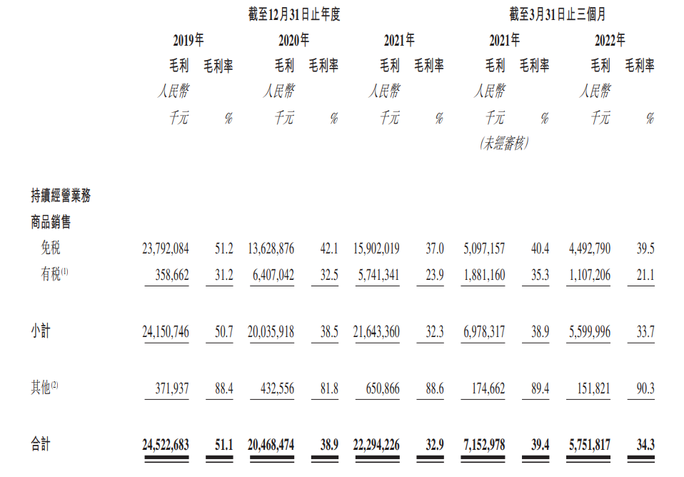 免税销售需受疫情、消费意愿等因素影响,有税品销售也很难成为支撑高增长的“长久之计”。根据中国中免在申请资料中的说法,2019年、2020年及2021年,公司毛利率分别为51.1%、38.9%及32.9%。而毛利率下降的主要原因,则为销售成本增加,包括就有税商品支付的关税、消费税及其他相关税项增加以及使用折扣及促销。