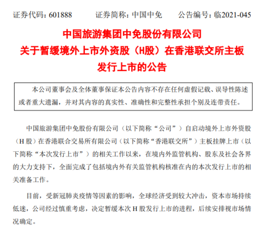 2021年首次递表时,中国中免可谓势头正盛。从同花顺中国中免A股的数据来看,2021年上半年公司营业收入为355.26亿元,同比增长83.98%;净利润为53.59亿元,同比增长475.92%。但是中国中免却在当年11月通过港交所聆讯后,于12月发布公告称受新冠肺炎疫情等因素的影响,全球经济受到较大冲击,资本市场持续低迷,公司经过慎重考虑,决定暂缓H股发行上市的进程。