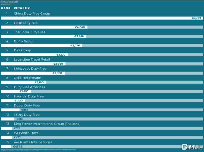 根据全球旅游零售行业权威媒体《穆迪戴维特报告》(The Moodie Davitt Report)所发布的《顶级旅游零售商报告》显示,中免集团在2021年蝉联登顶全球最大旅游零售商,其2021年的销售额是第二名乐天免税店的两倍多。