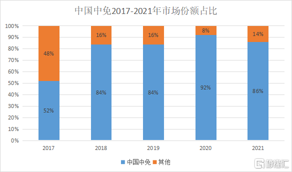 作为国内唯一具有全免税渠道资质的免税商,中国中免凭借早期即取得的特许经营权斩获先发优势,充分享受到了“牌照”红利,并成长为今天的行业龙头老大,占据着国内86%的市场份额。