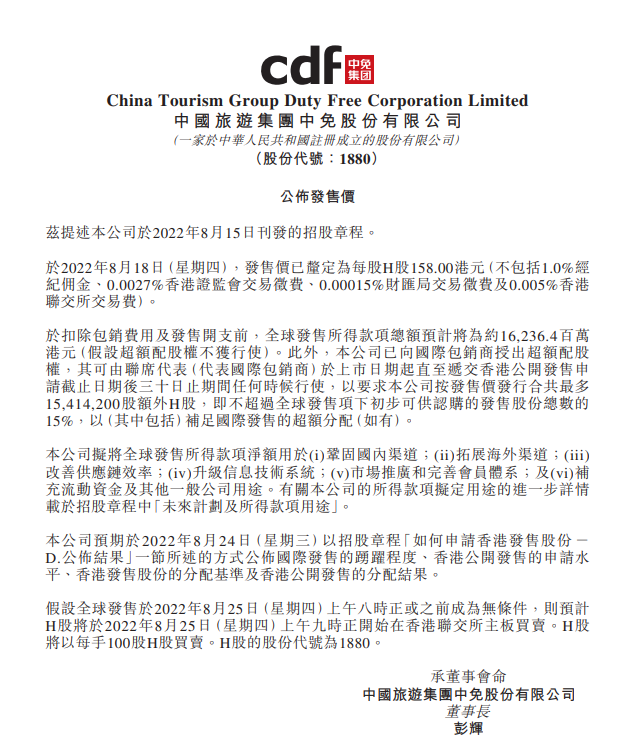 中国中免(HK1880)8月19日在港交所发布公告,香港IPO发行价已定为每H股158.00港元。全球发售所得款项总额预计将为约162.36亿港元(假设超额配股权不获行使)。预计将于8月25日(星期四)上午九时开始在香港联交所主板买卖。