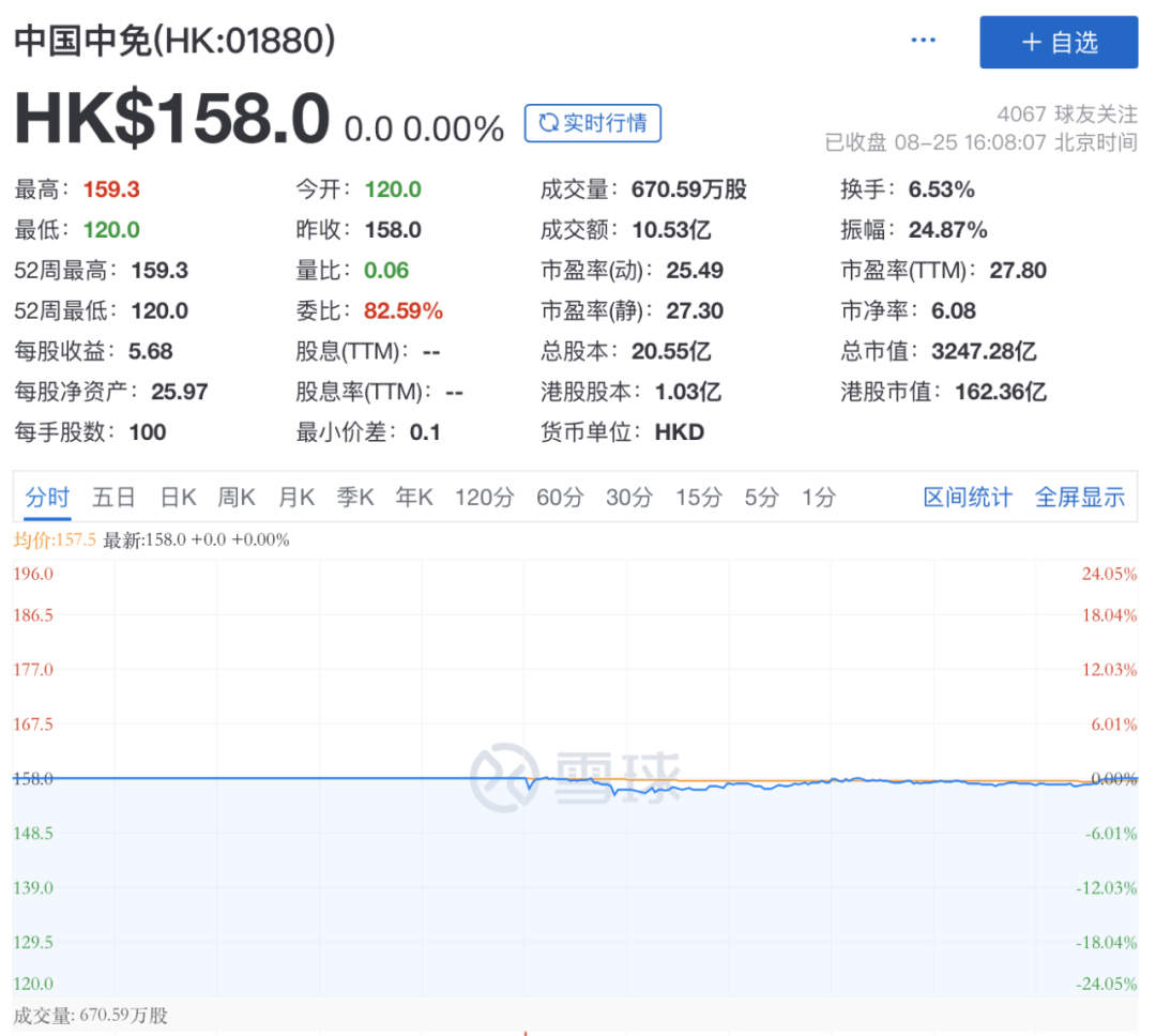 早前根据中国中免的公告,其H股发行价格确定为每股158港元,较8月24日其A股收盘价折价27.17%。而在8月24日港股暗盘的交易中,中国中免就已破发,收盘报价150.5港元,跌约4.75%。不过,截至8月25日收盘,中国中免港股收盘报价158港元,与发行价持平。
