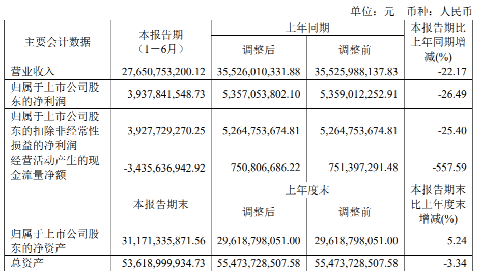 2022年上半年,公司实现营业收入276.51亿元,同比下降22.17%;实现利润总额52.97亿元,同比下降37.83%;实现归属于上市公司股东的净利润39.38亿元,同比下降26.49%。