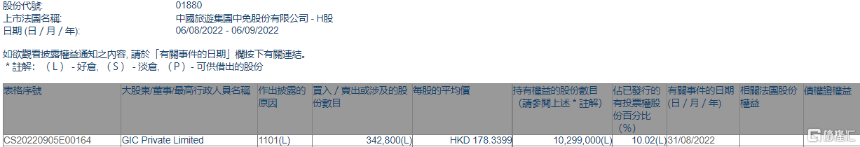9月6日根据联交所最新权益披露资料显示,2022年8月31日,中国中免(01880.HK)获GIC Private Limited在场内以每股均价178.3399港元增持34.28万股,涉资约6113.5万港元。